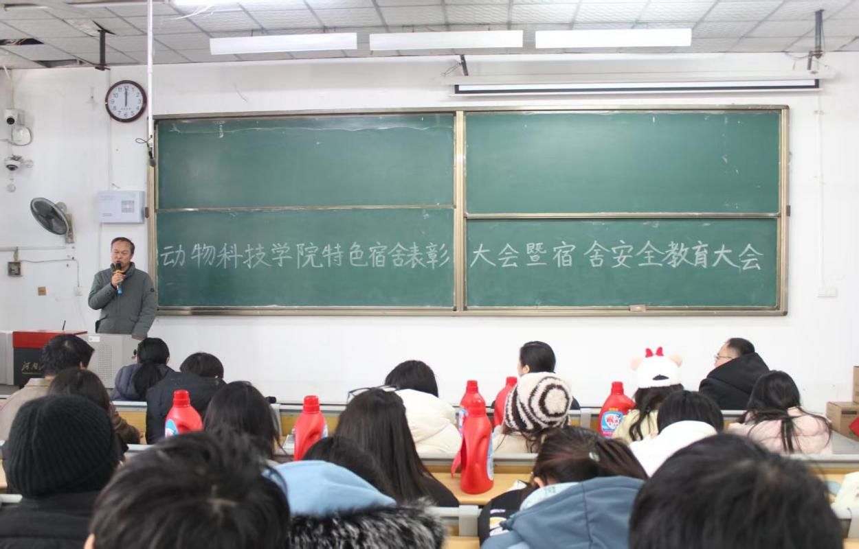 于1号教学楼合一教室召开特色宿舍表彰暨宿舍安全教育大会。学院主要党政领导、全体辅导员、各班级班长及全院宿舍学生代表参加会议。会议由腊邵凯主持。