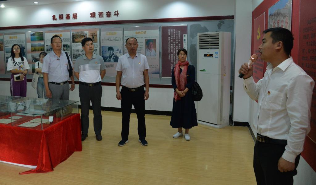 在唐庄镇吴金印同志先进事迹展览室,大家认真观看吴金印先进事迹采访录,聆听其扎根群众、艰苦创业、造福人民的感人事迹介绍。一个个治山治水用过的镰刀锄头、一张张“三化”协调发展示意图、一幅幅人民幸福生活图,生动再现了吴金印的奋斗精神和廉洁奉公的高尚情操。