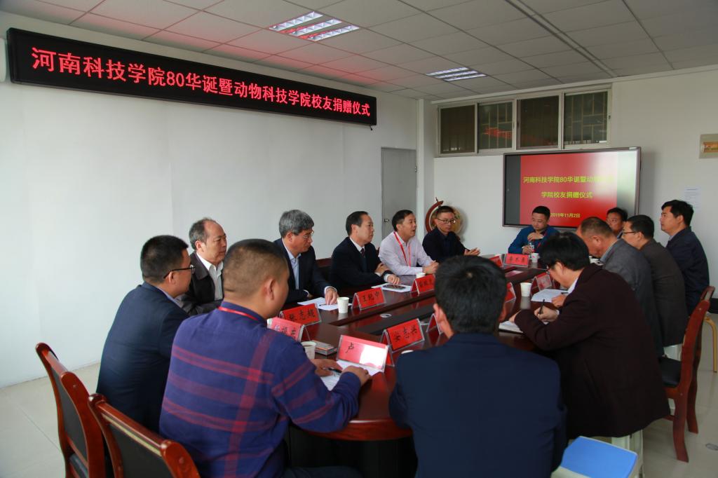 捐赠仪式上,郭书记首先介绍了与会领导和捐赠校友,然后由苗校长和手持捐赠牌匾的校友逐一合影留念。随后,河南广安生物科技股份有限公司董事长高天增和新乡市长城机械有限公司董事长王纪中分别代表捐赠校友致辞,对母校80华诞表示衷心祝贺,对被邀参加学校和学院系列活动感到非常荣幸。他们回忆了大学求学的美好时光,表达了对母校的满腔深情与无限眷恋,表示在母校不仅学到了知识和技能,更懂得了责任和担当,能够为母校发展尽一份绵薄之力,是校友们的无尚荣光。
