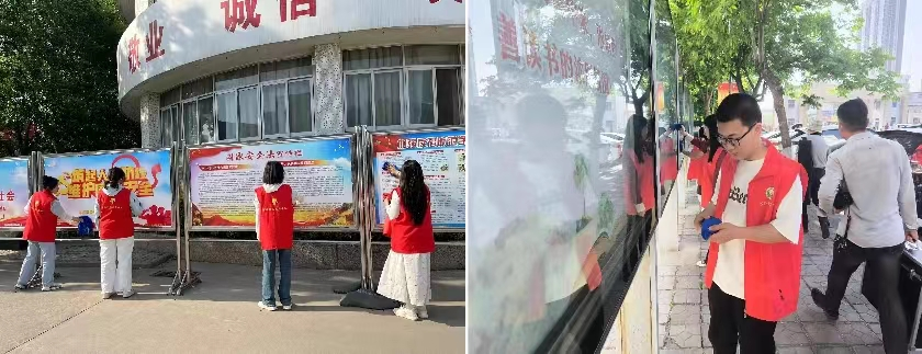 团员志愿者对学校实验楼、1号教学楼、零号楼、西操场等地的宣传栏进行清洁打扫,并借此机会学习宣传五四青年精神,以实际行动践行社会主义核心价值观,激励青年学生在实践劳动的课堂中“受教育、长才干、作贡献”,以服务和奉献奏响青年同学奋进的乐章。