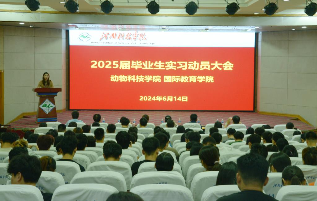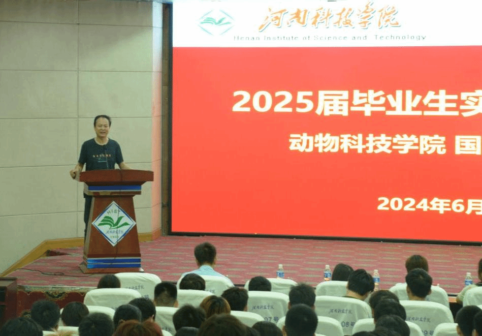 于图教201召开2025届毕业生实习动员大会,学院党委书记胡付广、副院长王磊、国际教育学院副院长沈军、团委辅导员及学生代表等300余人参加会议,牧原、温氏、瑞派和普特威4家优秀实习单位受邀参加,大会由团委副书记赵迁主持。